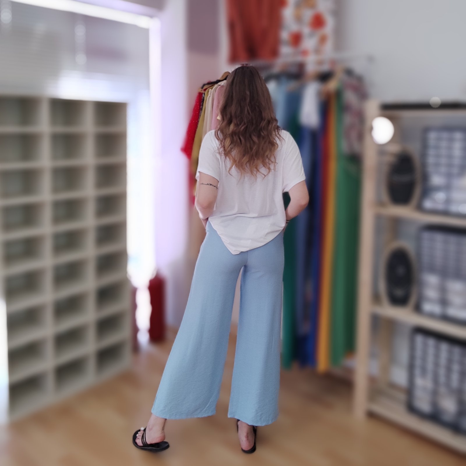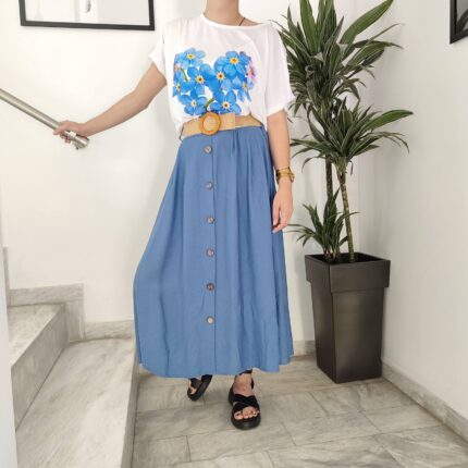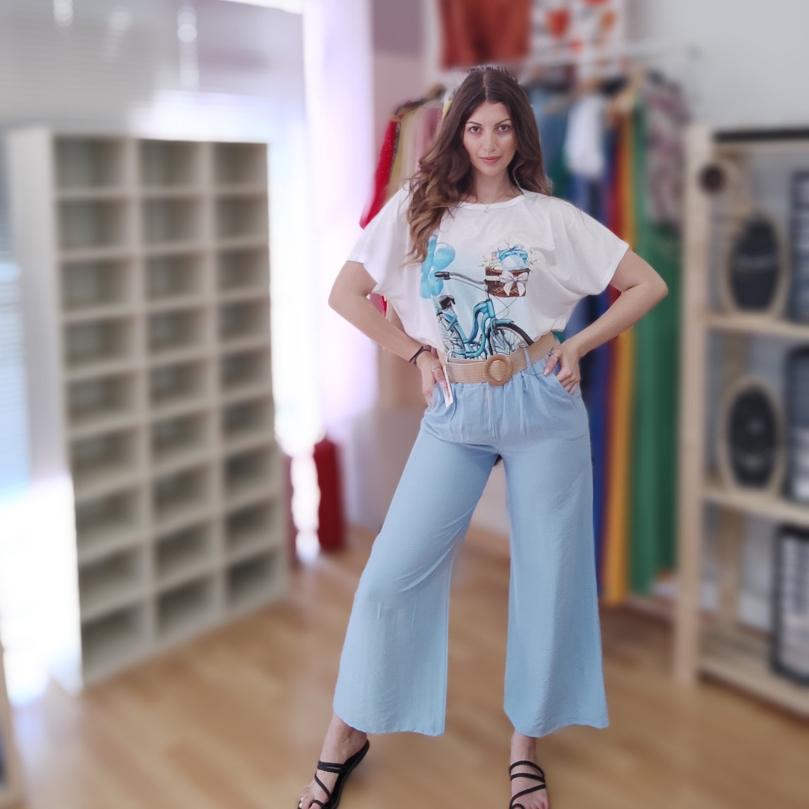 Παντελόνα γαλάζια με λάστιχο στην μέση & αποσπώμενη ψάθινη ζώνη 100% VISCOSE & T-shirt λευκό με στάμπα (σχέδιο ποδήλατο με γαλάζια μπαλόνια) 95% POLYESTER 5% ELASTAN. One size. Ιταλικής παραγωγής.