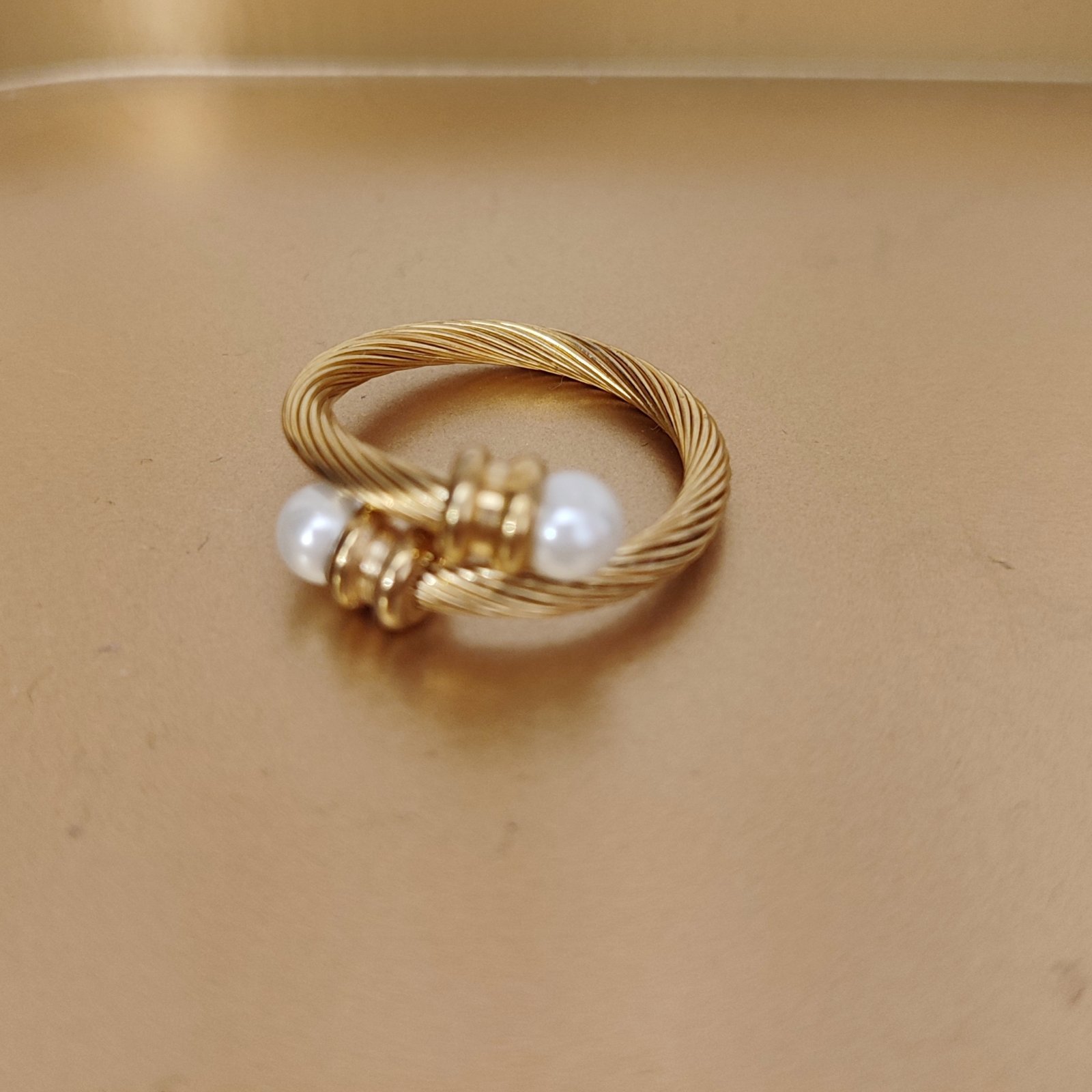 Ατσάλινο δαχτυλίδι με πέρλα σε χρυσή απόχρωση. Αυξομειώνει και προσαρμόζεται σε όλα τα δάχτυλα.