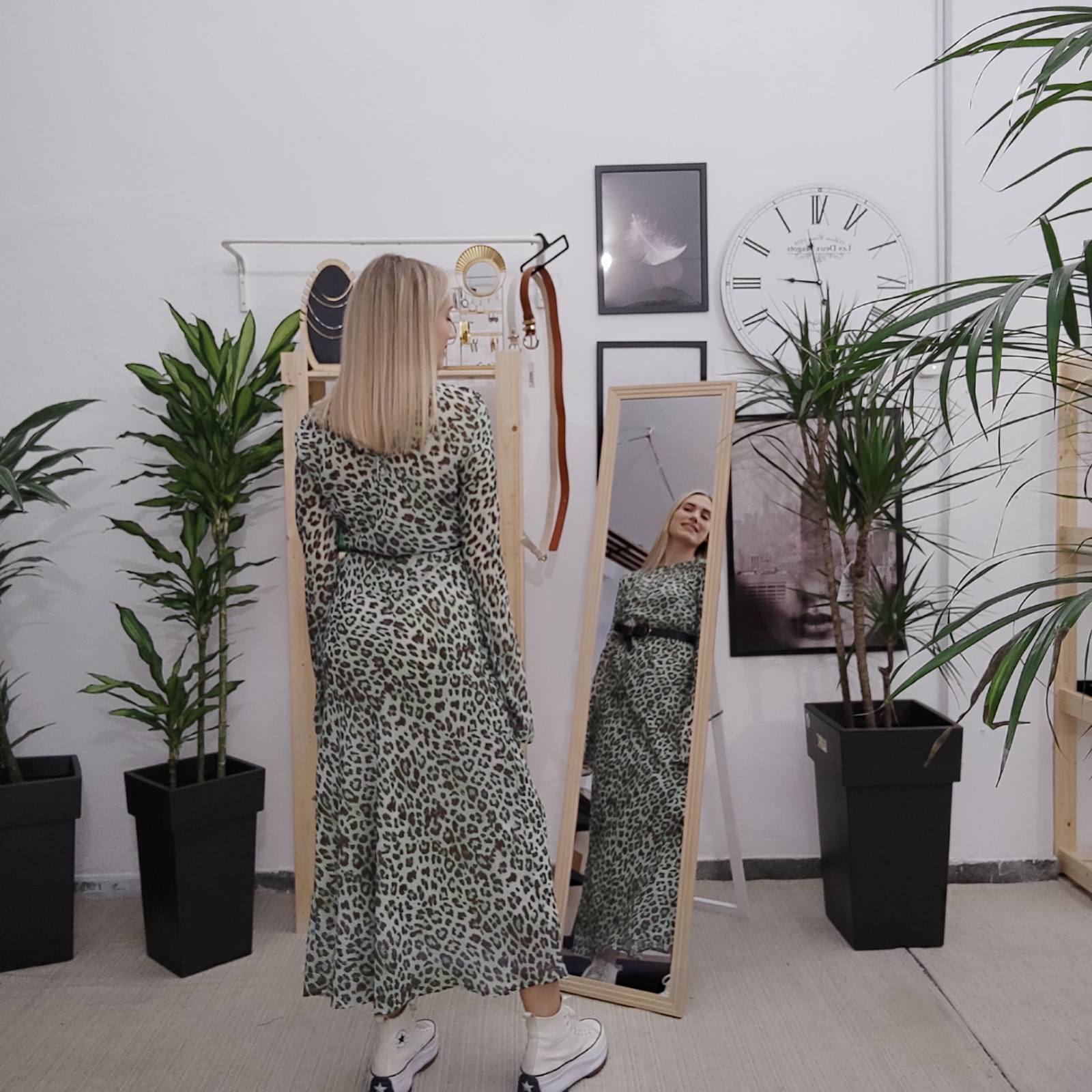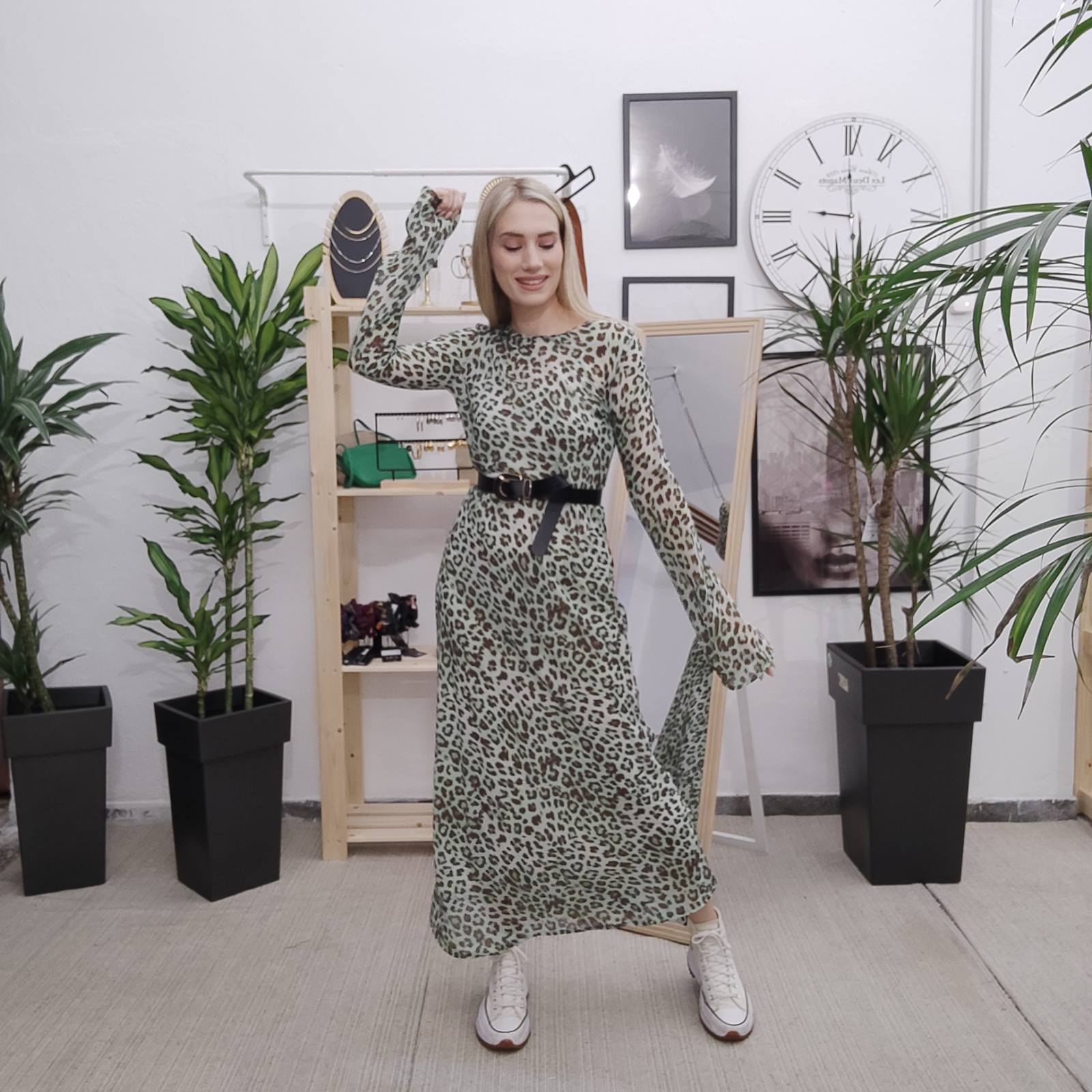 Φόρεμα λεοπάρ με ιδιαίτερα μανίκια σε πράσινο χρώμα.