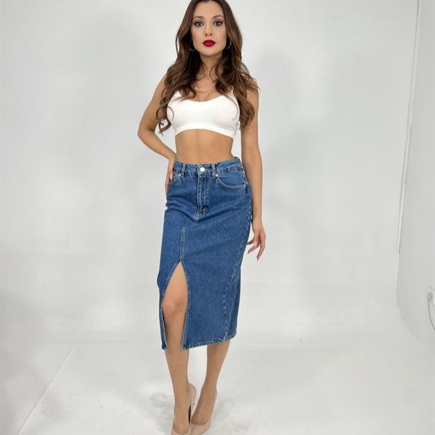 Jean φούστα με σκίσιμο μπροστά. Διαθέσιμα νούμερα S/M/L.