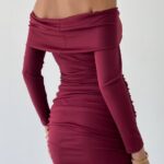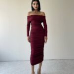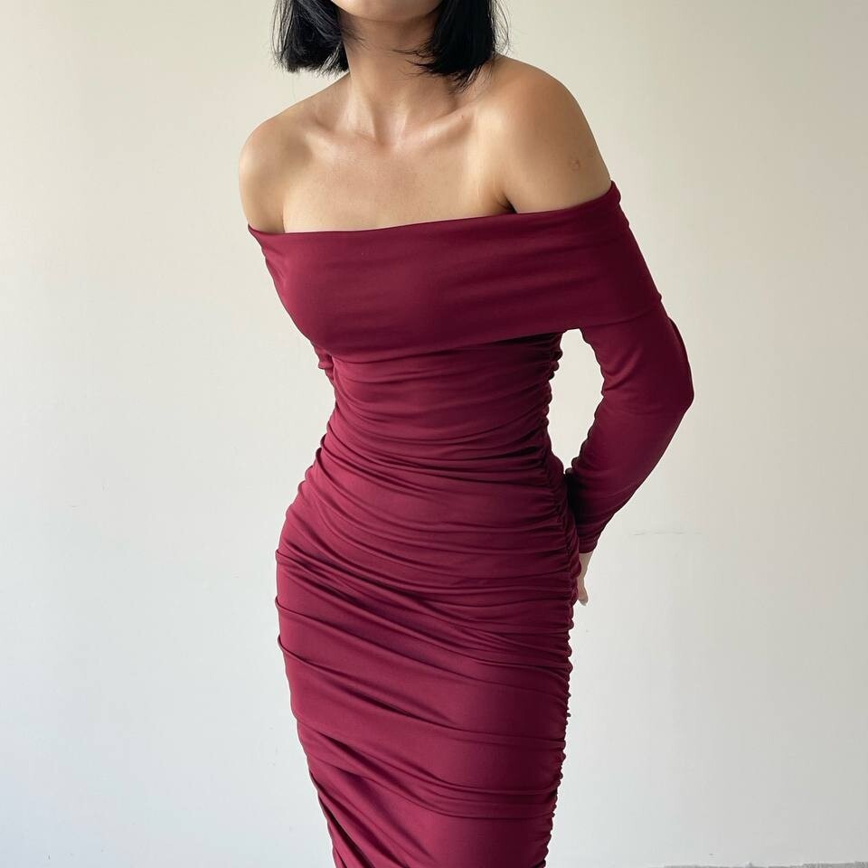 Midi εφαρμοστό φόρεμα με έξω ώμους. Διαθέσιμα νούμερα S/M/L.