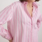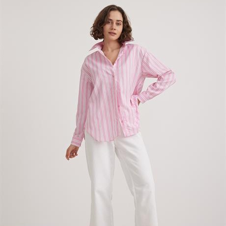 Πουκάμισο ροζ oversized με λευκές κάθετες ρίγες. Διαθέσιμα νούμερα S/M/L.