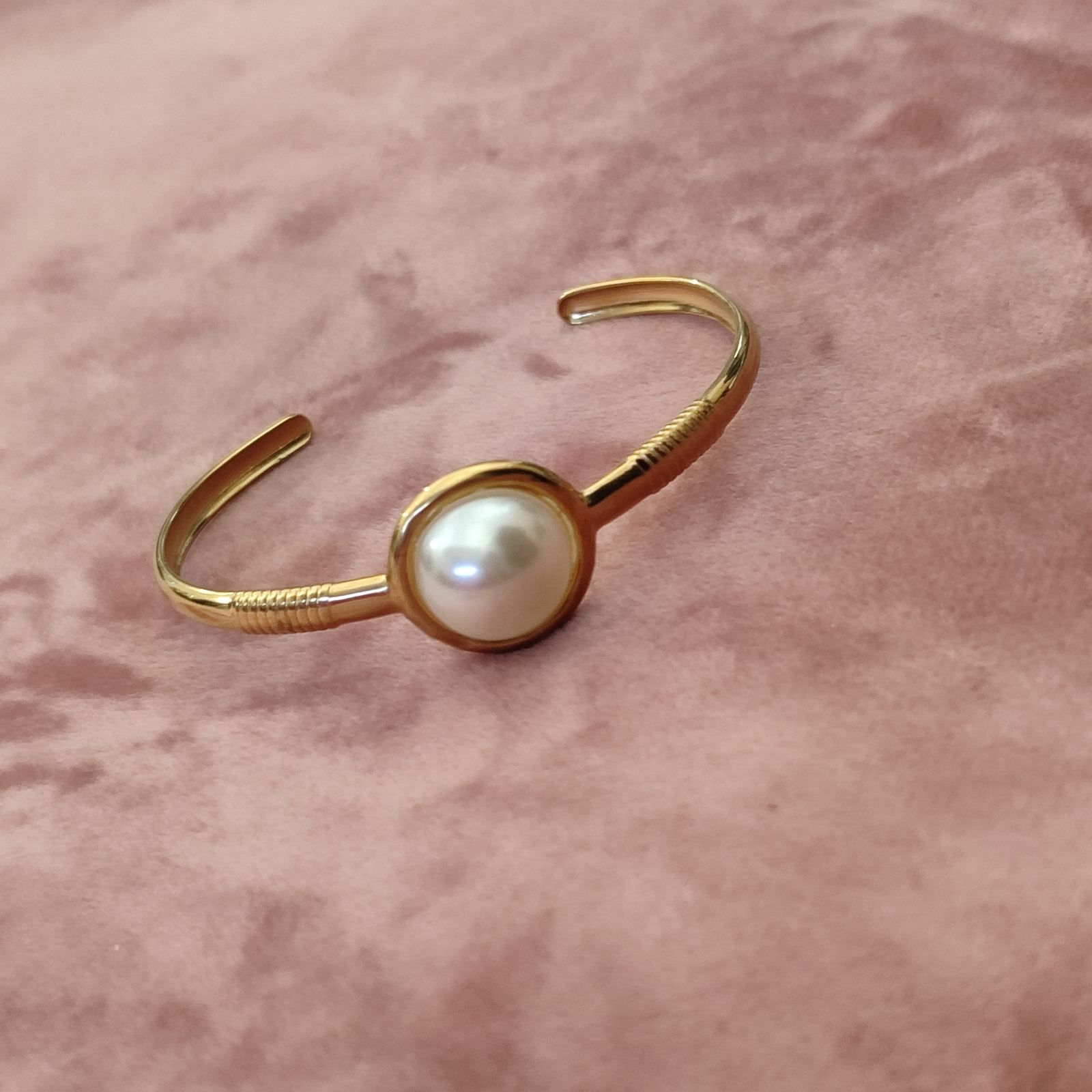 Ατσάλινο βραχιόλι-χειροπέδα με πέρλα και σχέδιο με γραμμές σε 2 αποχρώσεις χρυσό και ασημί. Δεν προκαλούν αλλεργίες και δεν μαυρίζουν.