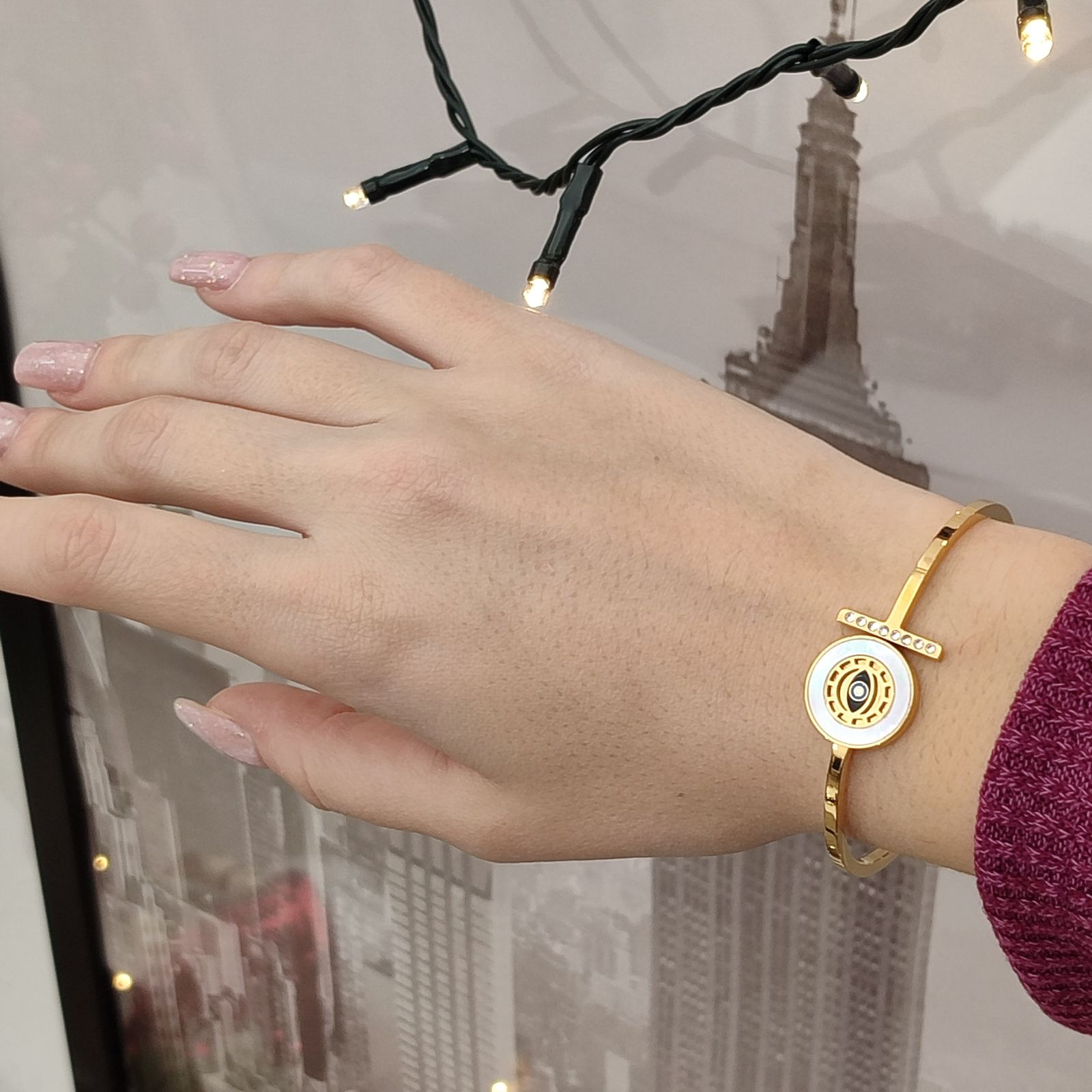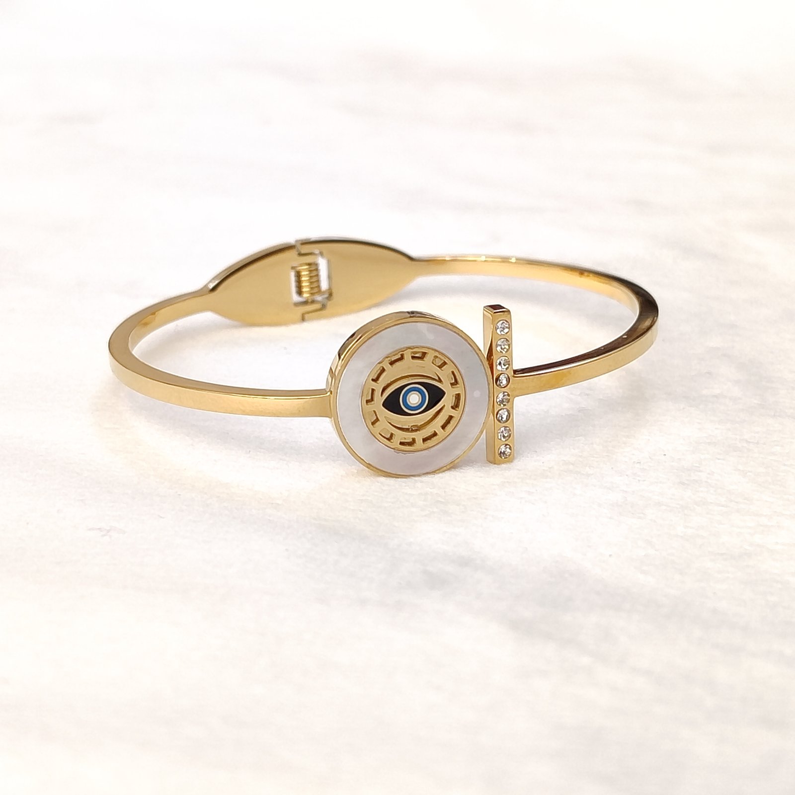 Ατσάλινη χειροπέδα ματάκι με strass σε χρυσή απόχρωση. Δεν προκαλούν αλλεργίες και δεν μαυρίζουν.